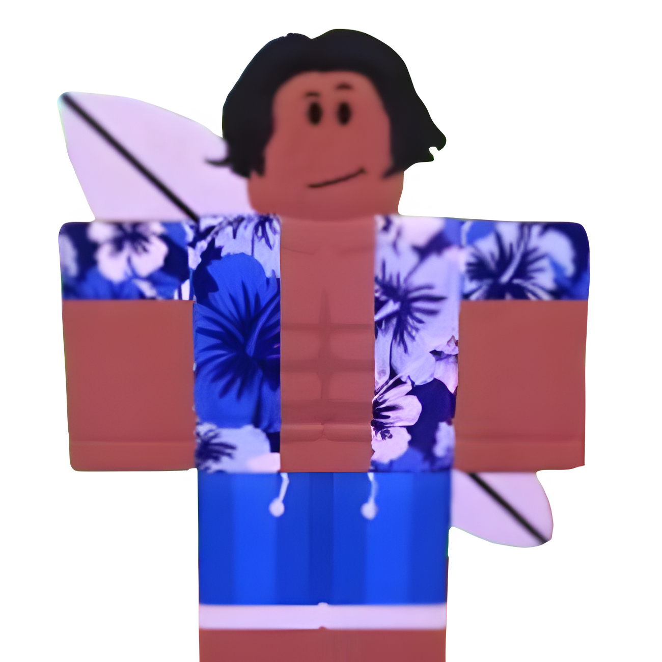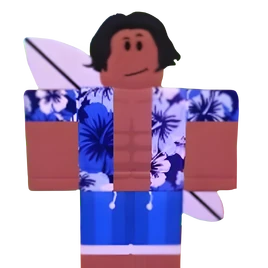 The Surfer wears a white and blue shirt, revealing his abs. He wears blue shorts. He has black, wavy hair and a surfboard on his back.
